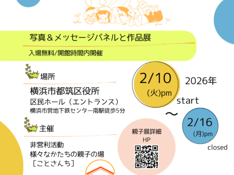 『いろんなかたちの親子展』を開催します♪ 《場所》横浜市都筑区役所区民ホール(エントランス) 横浜市営地下鉄センター南駅徒歩4分 《期間》2026年2/10(火)午後〜2/16(月)14:00頃 区役...