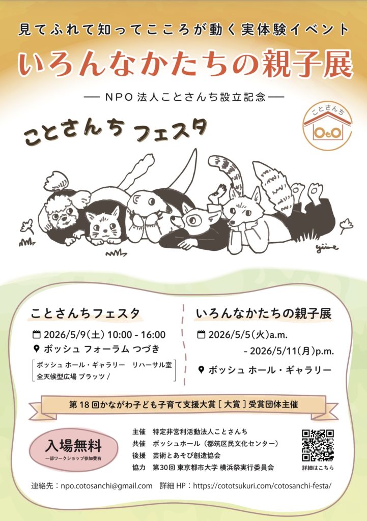 ことさんちフェスタ2026 見てふれて知ってこころが動くイベント ボッシュホール都筑区民文化センター 2026-02-12 by cotopas 誰もが楽しめる場所と時間を 行ってみよう!こころ動かす何かがあります♪ 開催日時 2026年5/9(土)10:00〜16:00 (ギャラリー 5/5(火)〜5/11(月)) Screenshot 詳細決定次第開示 お楽しみに♪ 主催 特定非営利活動法人ことさんち お問合せ✉️はここをクリック
